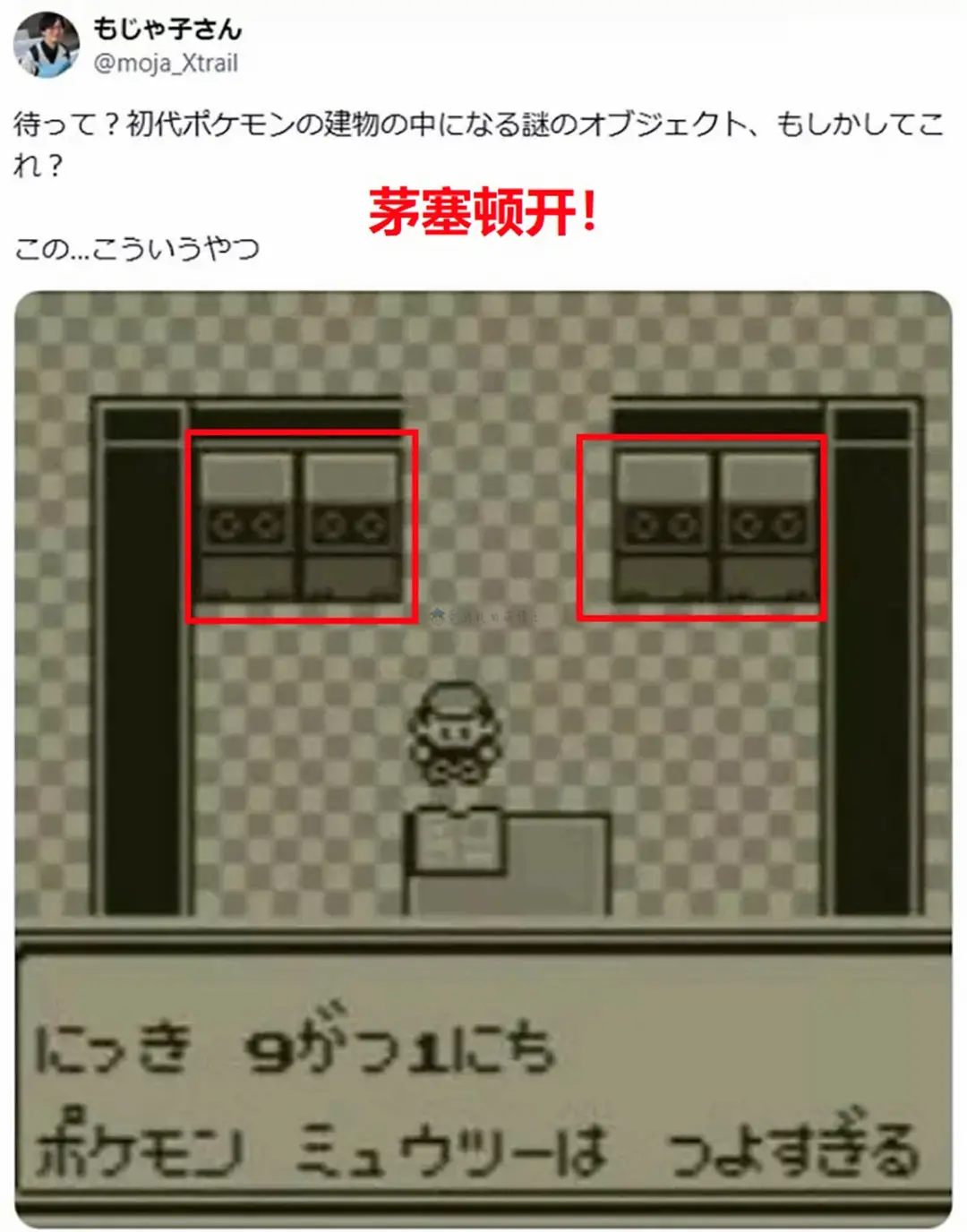 有趣的是:“ichikawakon”的贴文被另外一位网友“もじゃ子さん(社群ID为moja_Xtrail)”看到了,后者惊觉:“等一下?所以初代《宝可梦》建筑物里摆放的那个神秘物体,该不会就是你们讲的老电脑吧”?配图是《宝可梦》初代游戏(1996年推出)的截图,里面那四台机器的确和上面分享出来的使用磁带存储器的古董电脑一模一样!考虑到当时游戏开发人员的年纪以及产品世界观背景,场景里有他们熟悉的老电脑没有任何问题。