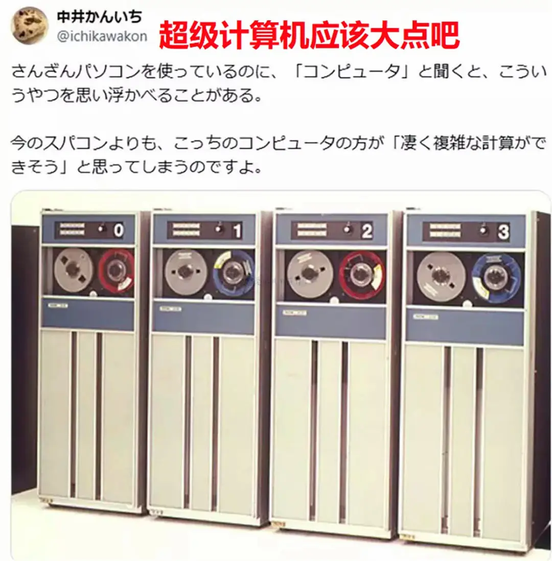 大家且听博士慢慢道来。一开始慧仁策略,一位社群ID为“ichikawakon”的网友发文表示:虽然我平常都在用电脑,但每次听到Computer这个词汇的时候,脑海里还是会浮现出一种印象。总觉得比起现在的所谓“超级电脑”,以前的老电脑反而更像是能做出“超级复杂计算”的东西啊!而在他的配图中,四台巨大的机器跃入眼中,每台机器都有两个大“圆盘”。