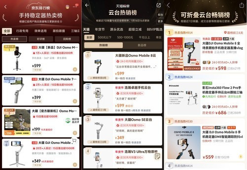 大疆OsmoMobile8在开年之际成功登顶京东手持稳定器热卖榜、天猫云台热销榜、拼多多可折叠云台畅销榜Top尚牛在线,并已蝉联天猫云台热销榜榜首8周。